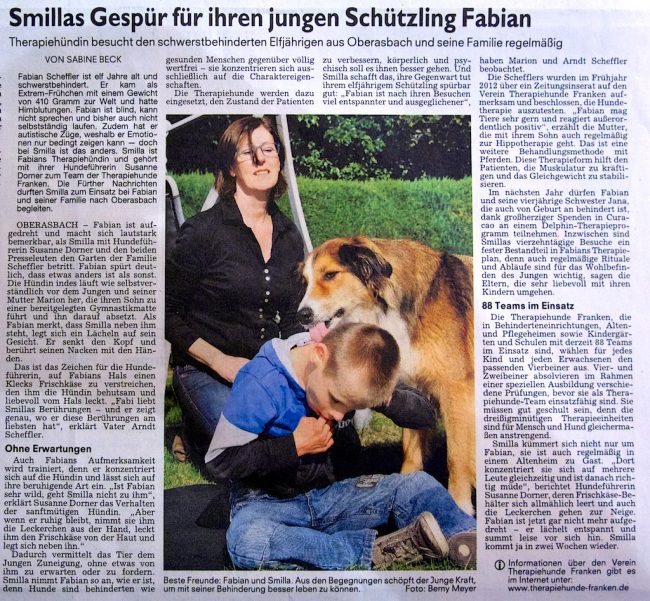 Vor gut 2 Wochen hat uns ein Team der Fürther Nachrichten besucht und einen Artikel über Smilla und Fabian geschrieben. Smilla ist ein Therapiehund vom Therapiehunde-Franken e.V. aus Nürnberg. Sie besucht mit Ihrer Besitzerin unseren Kurzen alle 2 Wochen. Hier ist der jetzt erschienene Artikel.
